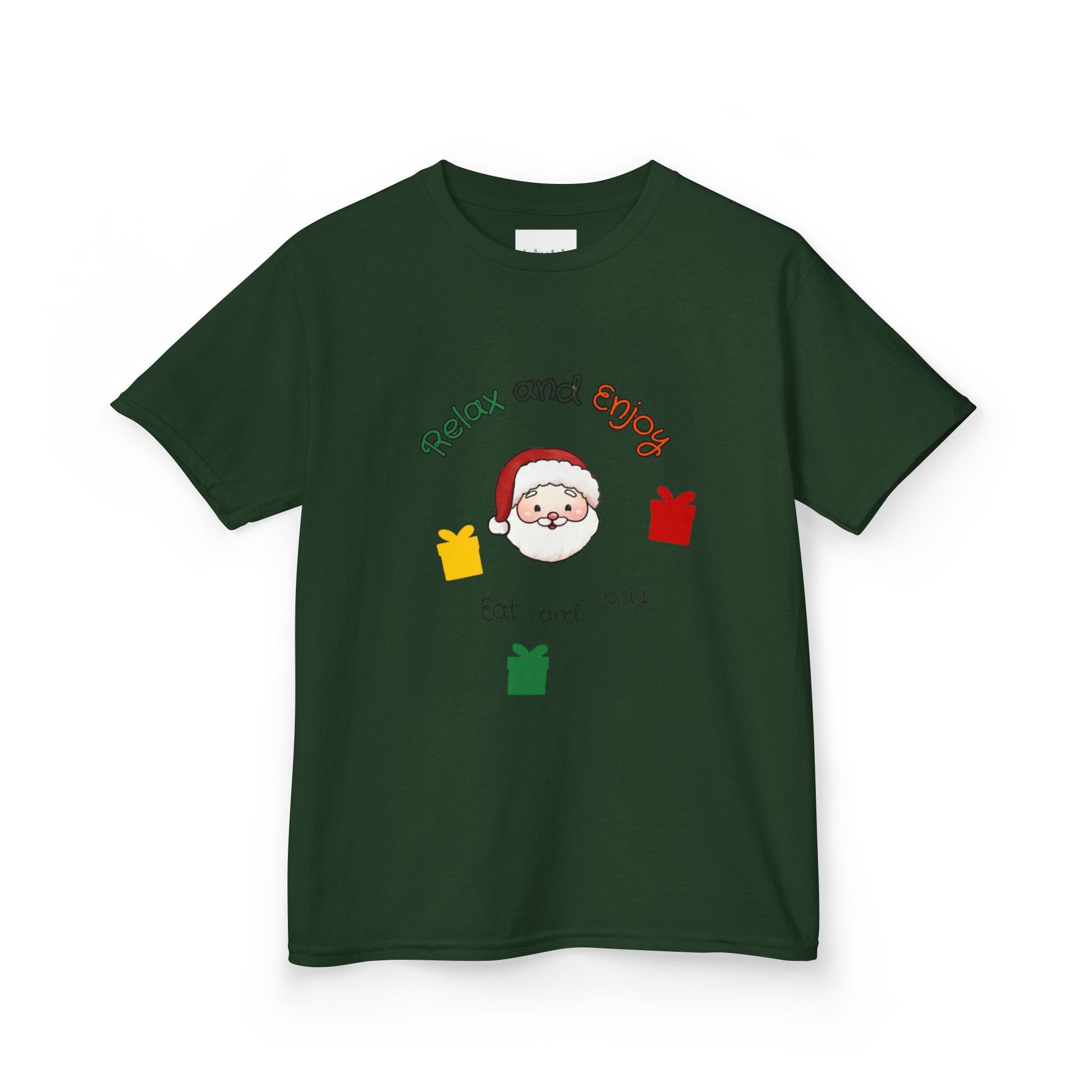 A soft, midweight kids tee with a cheerful holiday design that feels cozy and easy to wear. The front features a friendly Santa face framed by the playful phrase “Relax and enjoy” and three small, colorful gift icons — a simple scene that reads like a warm, calm promise on busy holiday days. The classic crew neckline and straight fit let little ones move freely while the ribbed collar and shoulder tape keep the shape through repeated washes. Breathable US-grown cotton gives a smooth hand and gentle drape, so this t-shirt layers well under sweaters, holds up to holiday activities, and stays comfortable during long family gatherings.